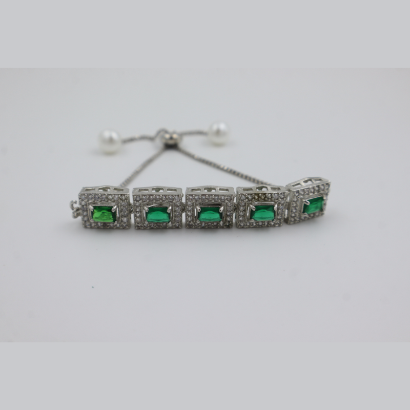 A luxurious silver bracelet featuring rectangular green gemstones set in square frames, accented with sparkling white stones.