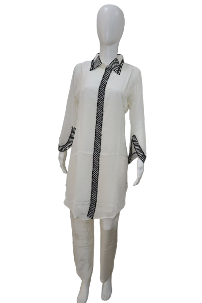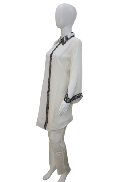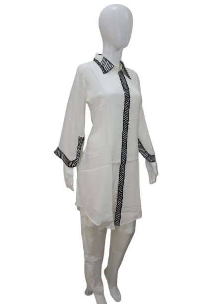 A contemporary white kurti set with black striped detailing on the collar, placket, and sleeves, exuding a chic and modern vibe.
