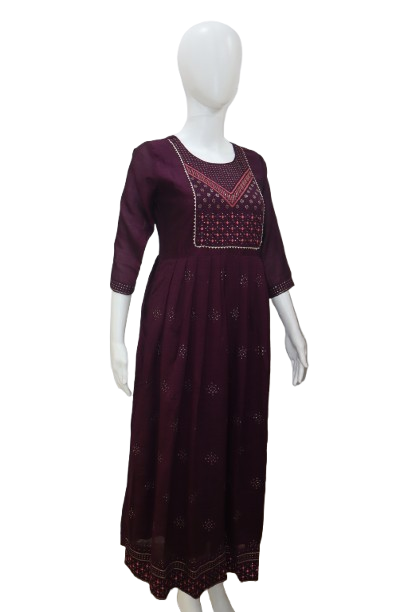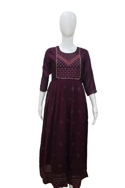 A graceful maroon ethnic kurti featuring intricate embroidery on the yoke and hem with a flared, ankle-length silhouette.