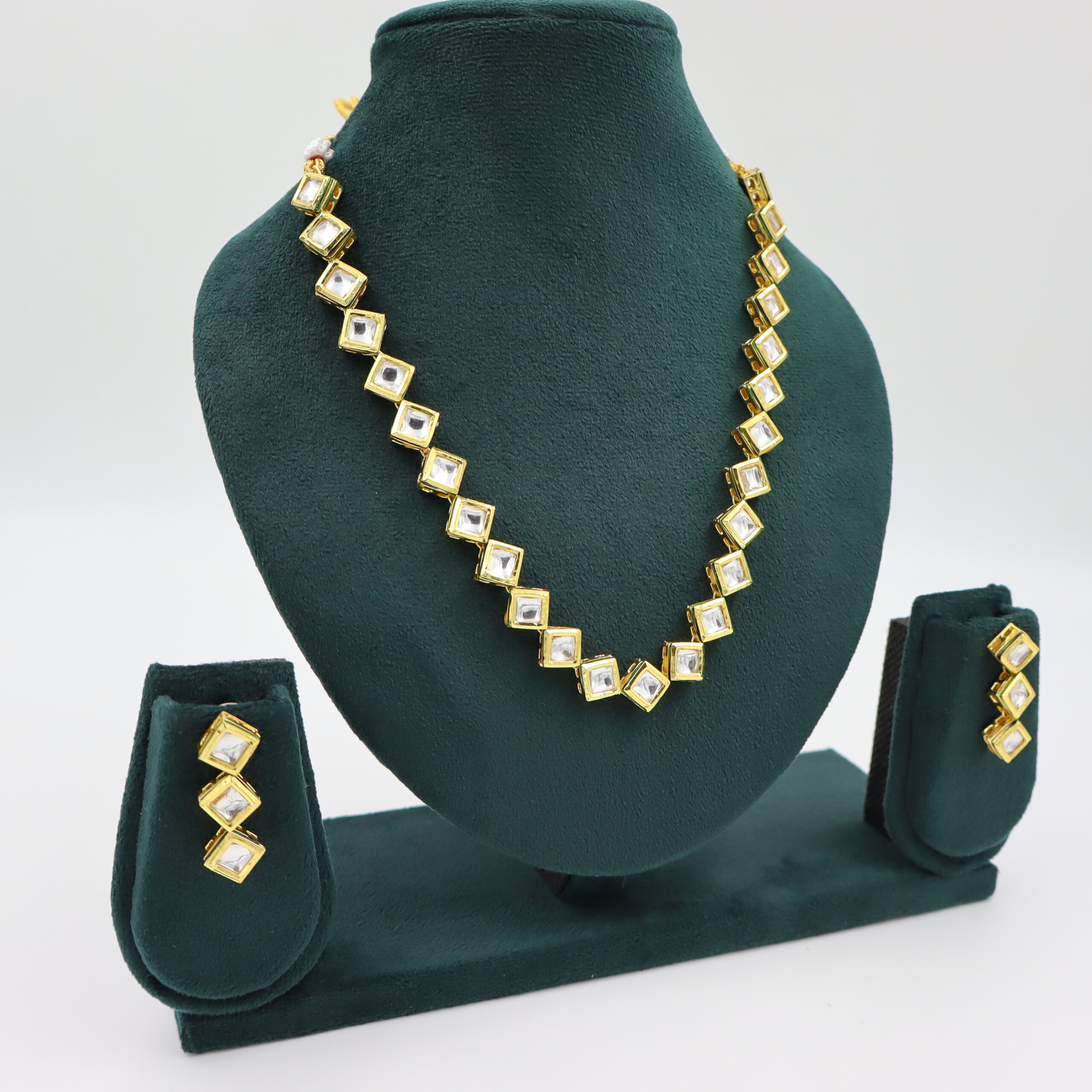 A golden necklace and earring set featuring square-shaped clear stones in a symmetrical, elegant design.