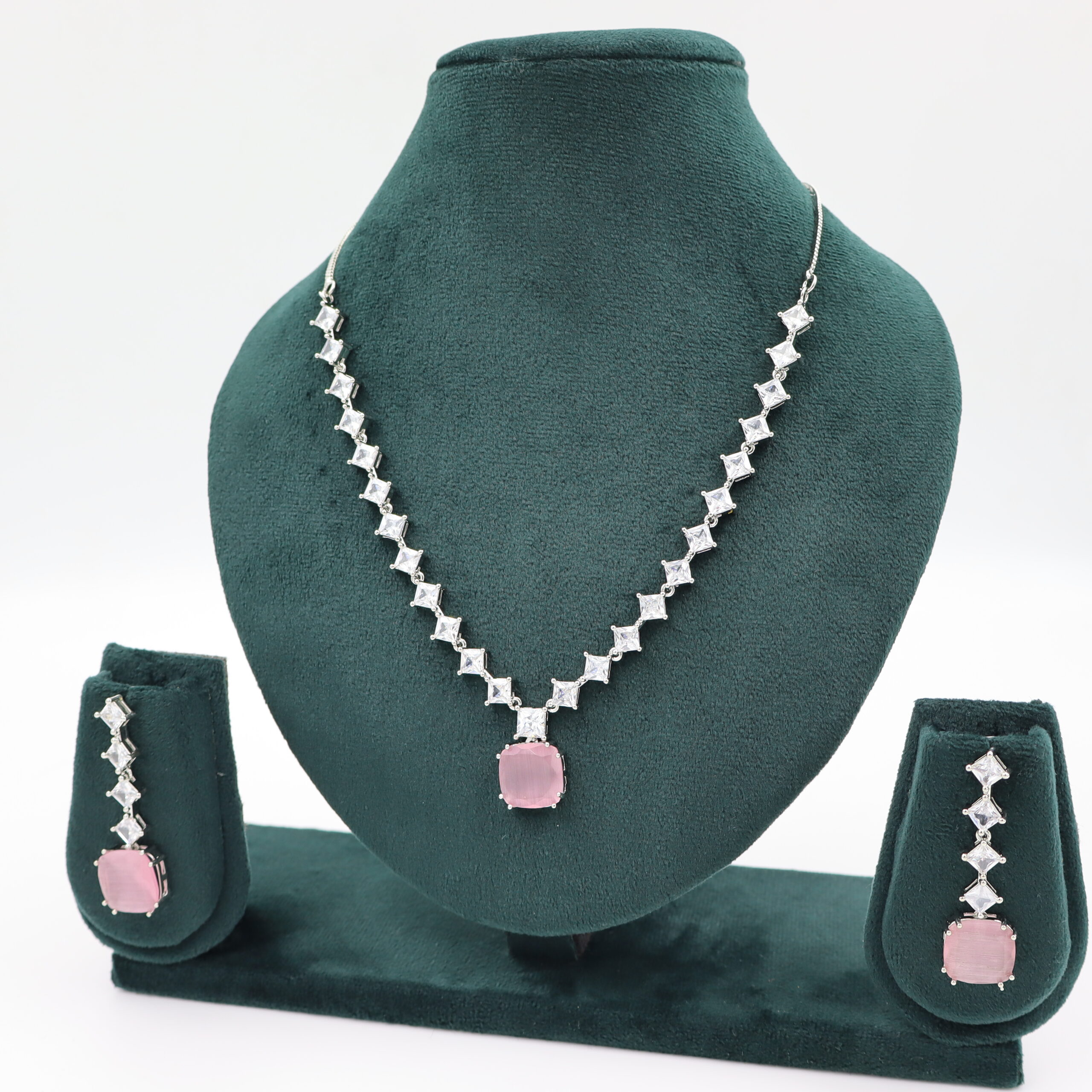 A luxurious silver necklace and earring set featuring square-cut clear gemstones arranged in a symmetrical pattern.