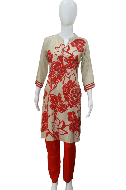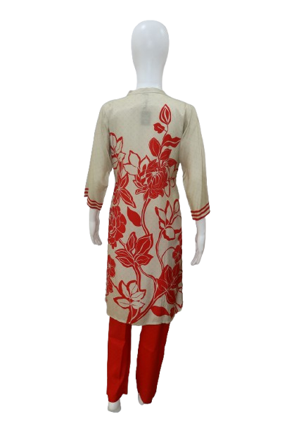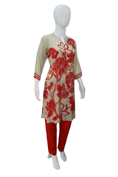 A chic beige and red floral printed kurti set with three-quarter sleeves and matching red pants for a vibrant ethnic look.
