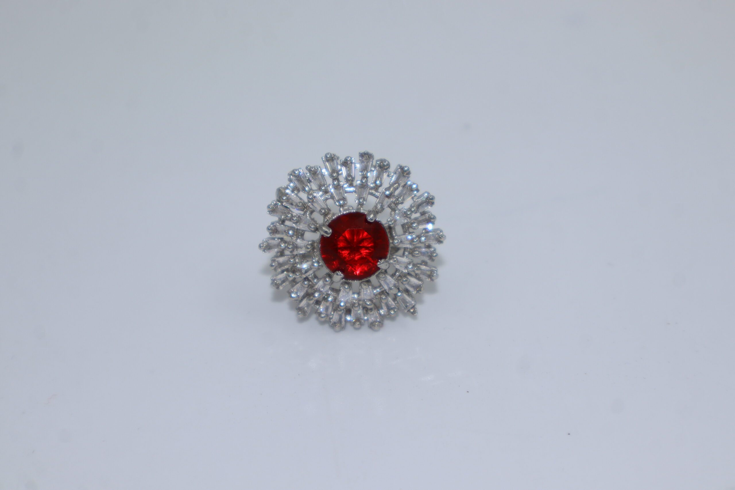A luxurious silver ring featuring a floral design with red and clear gemstones, elegantly displayed on a green velvet stand.