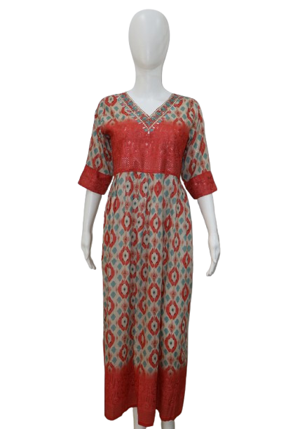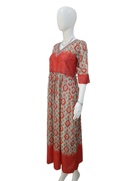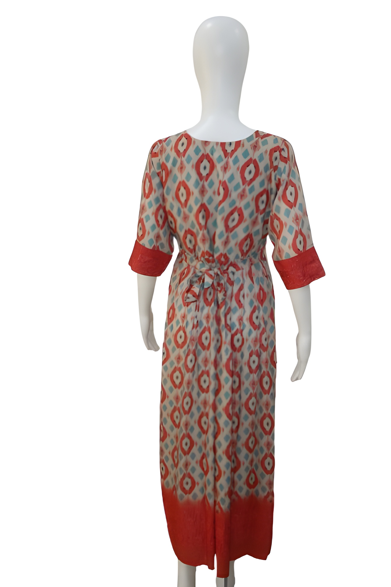 An elegant ankle-length ethnic kurti with Ikat print, embroidered V-neck, and contrasting red yoke and hem.