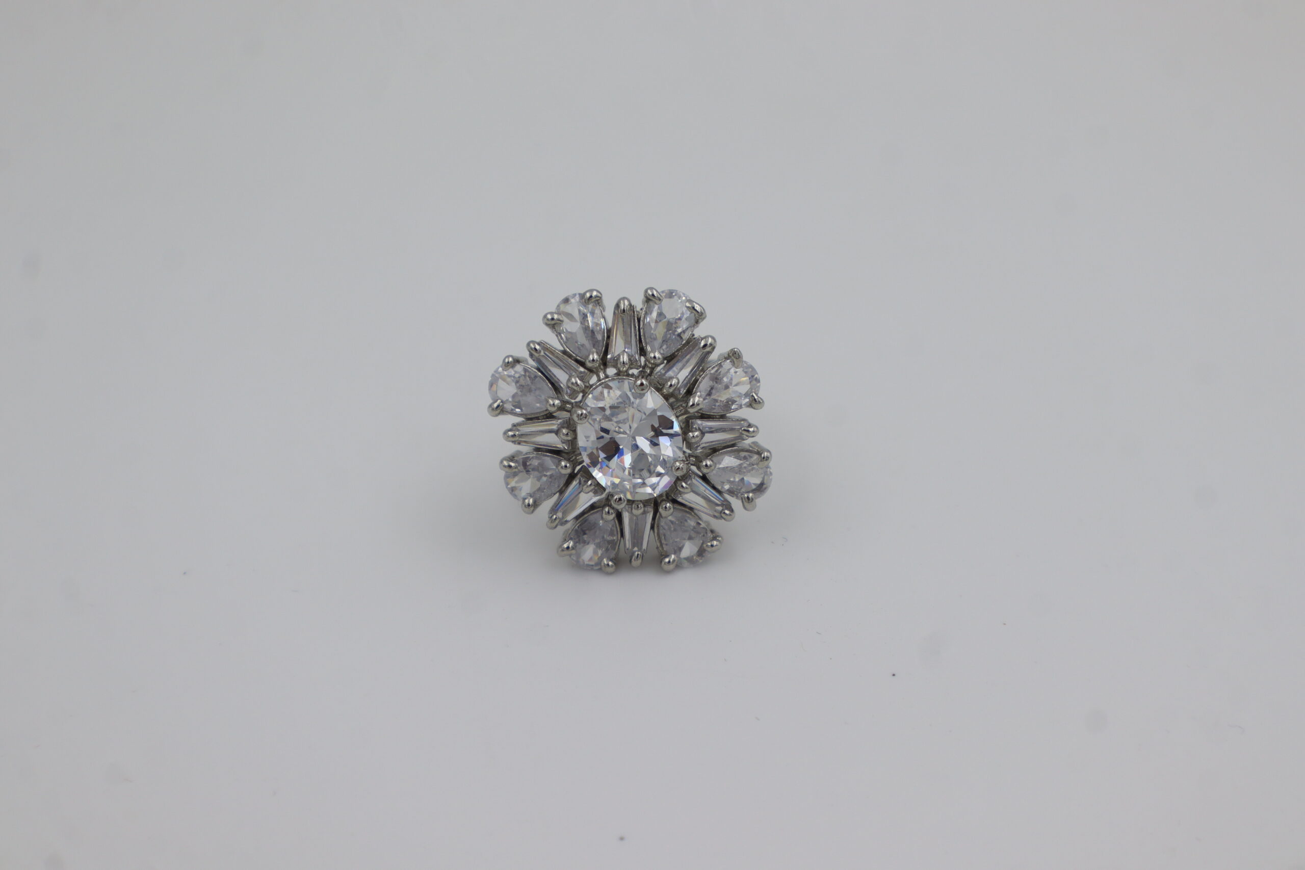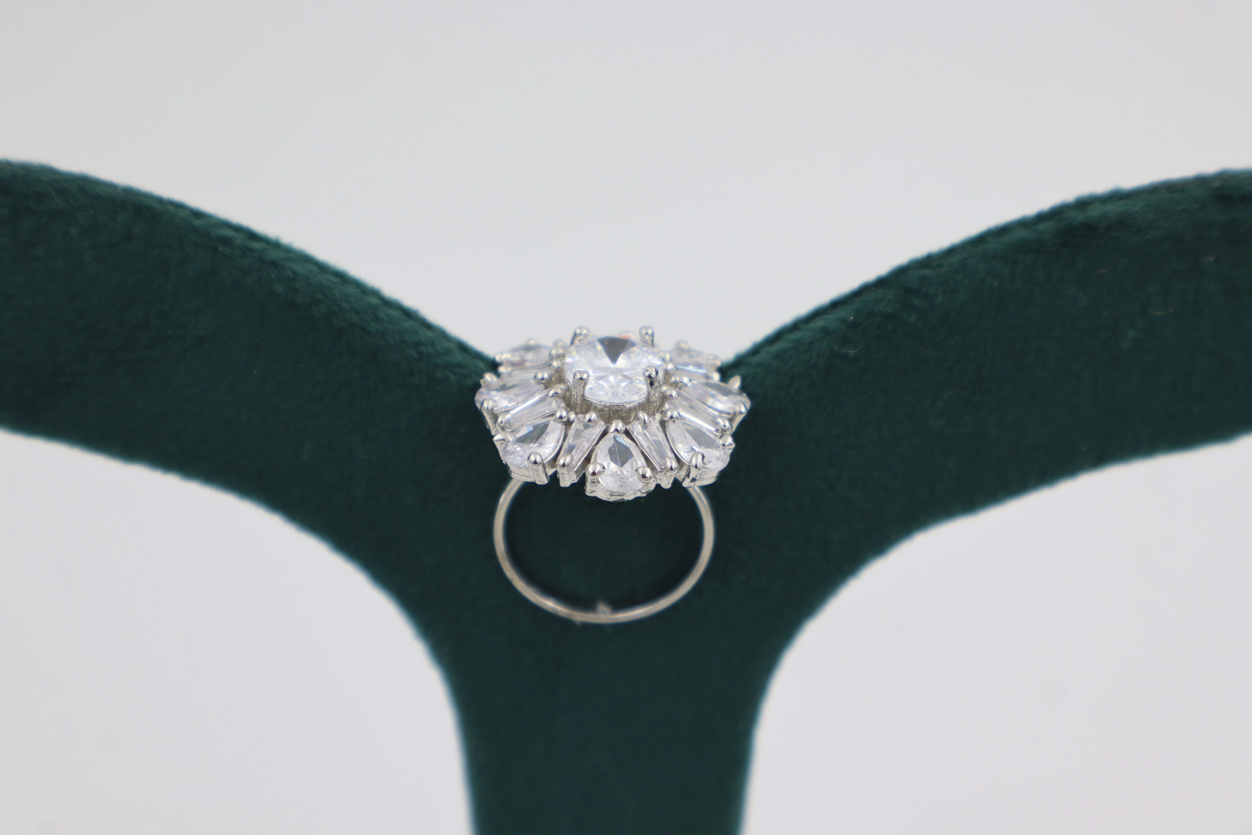 A luxurious silver ring featuring a floral design with white and clear gemstones, elegantly displayed on a green velvet stand.